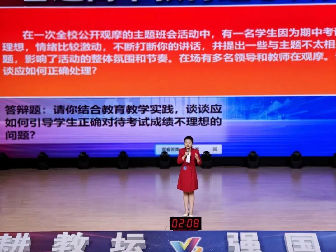 在随机抽取的教育案例分析与答辩环节,她针对观摩课中学生的情绪波动,系统阐述了“即时安抚—课堂回归—课后深谈—家校协同”的全流程应对策略,将突发事件转化为情感联结与教育契机,赢得评委高度认可。